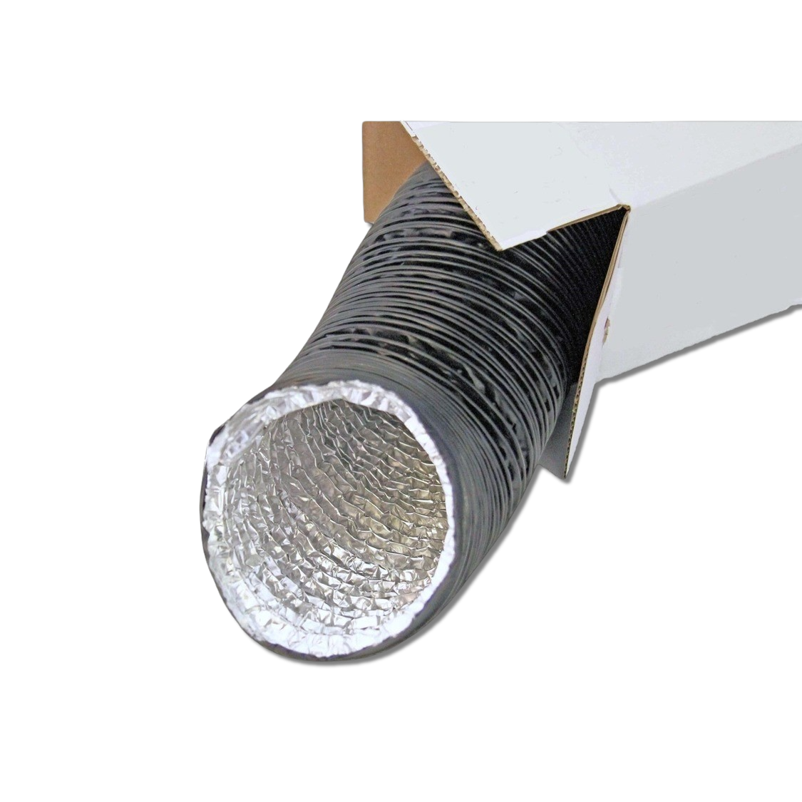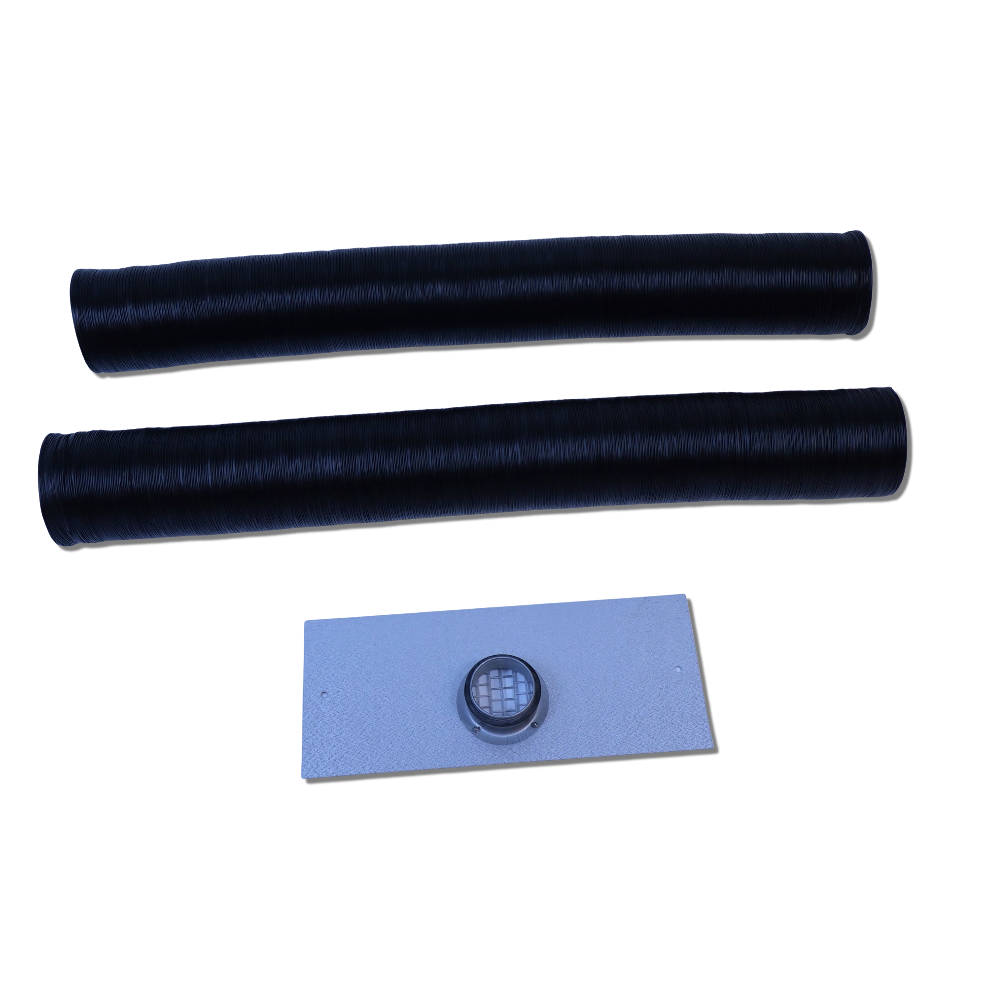Tillbehör för en komplett installation av avfuktare i krypgrunder. Det består av utvändig utloppsplåt i aluzink och två st 10 m, ∅102mm flexibla torrluftsslangar i kraftig stålarmerad aluminiumfolie.