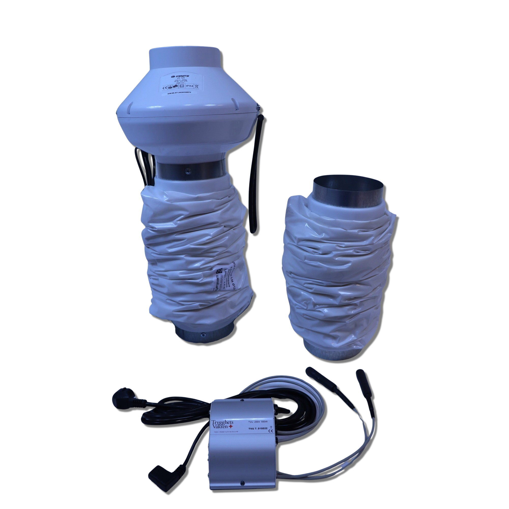 Uppgraderingspaket för TrygghetsVakten Krypgrund till TrygghetsVakten Pro-X. Paketet innehåller ventiationsstyrning samt fläkt för att skapa undertryck i krypgrunden.